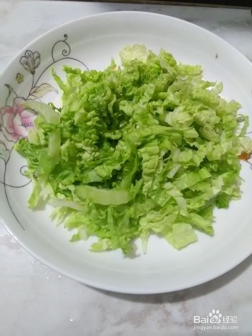 将白菜切成均匀的丝,在锅中放入清水,水开后,将白菜丝放入锅中焯一下水,然后捞出来控干。