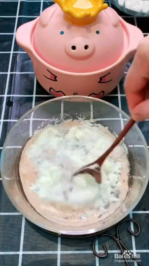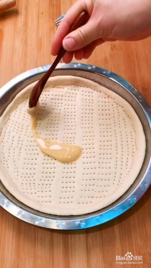 锅中刷油,放入锅中,再用叉子插上 排气孔;再刷上炼乳。