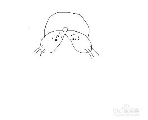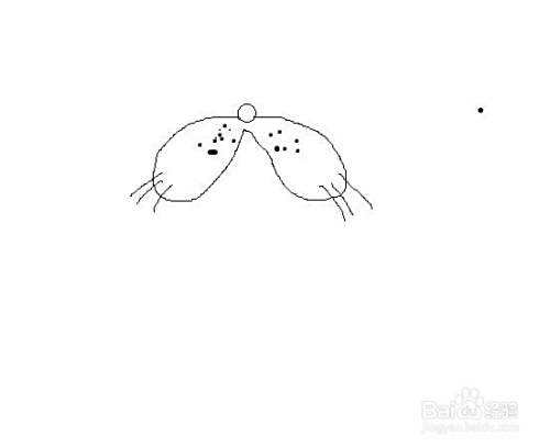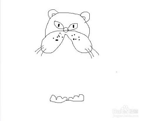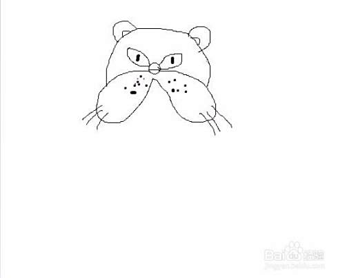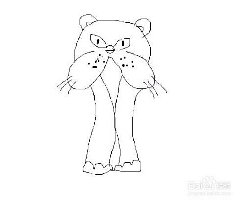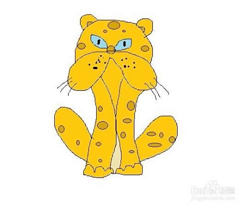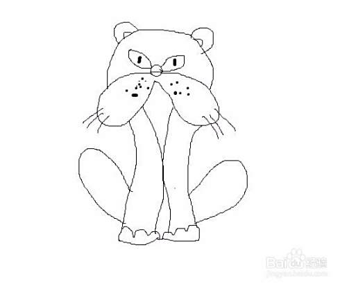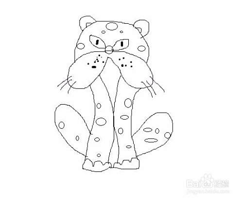 之后画出坐在地上的豹子的赘肉的斑点和胡须,斑点画在鼻子附近,不要画的太多,不好看,胡须画在外侧即可,如图所示。