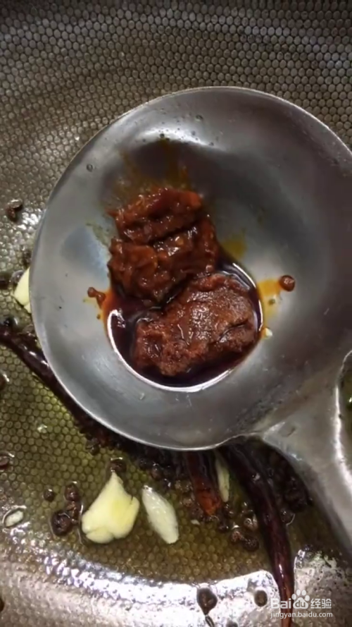 我们在锅中放入食用油,油热后加入花椒,干辣椒,小火煸出香味,然后加入姜蒜爆香,放入豆瓣酱和辣椒酱炒出红油,再放入酱油,蚝油,翻炒一下