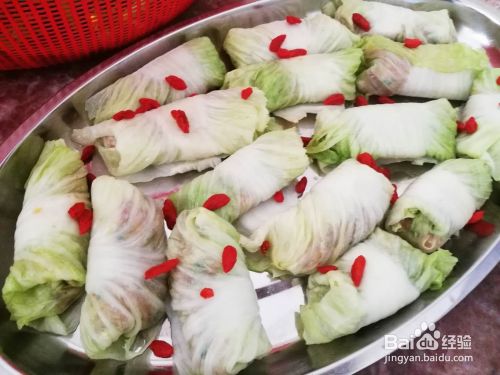 第五道菜金玉满堂:这道菜是用烫过的大白菜叶子包裹着猪肉虾仁馅料,撒上几粒枸杞,大火蒸熟,勾芡即可!这道菜看起来跟碧玉一样,所以也叫金玉满堂!