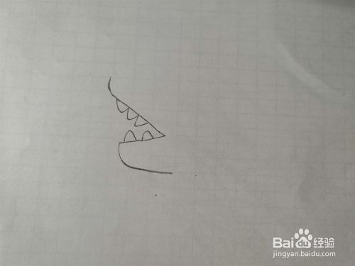 首先画出鳄鱼的嘴巴,画出鳄鱼大大的牙齿,如下图所示。
