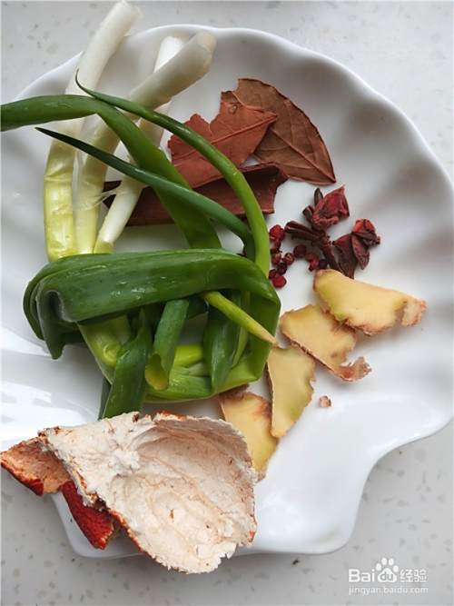 大葱洗净打成葱结,姜切成片,再准备好香叶、花椒粒、八角、桂皮、冰糖、橙皮。