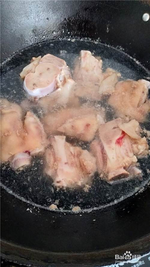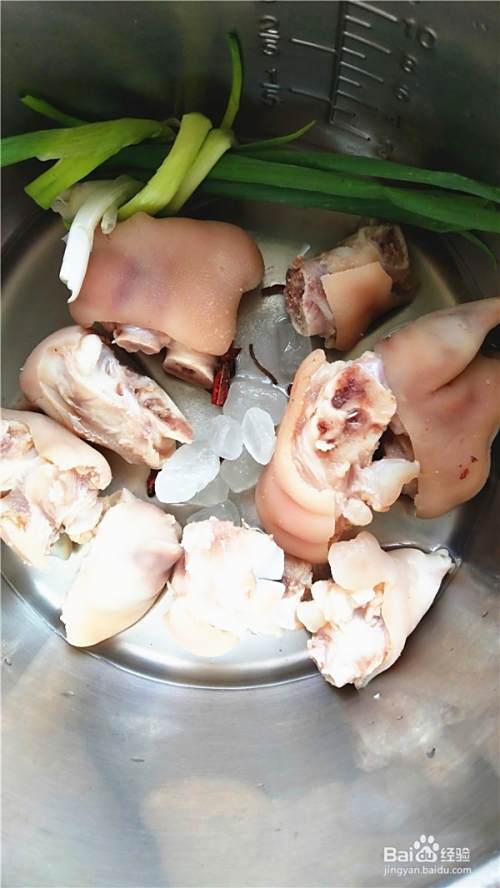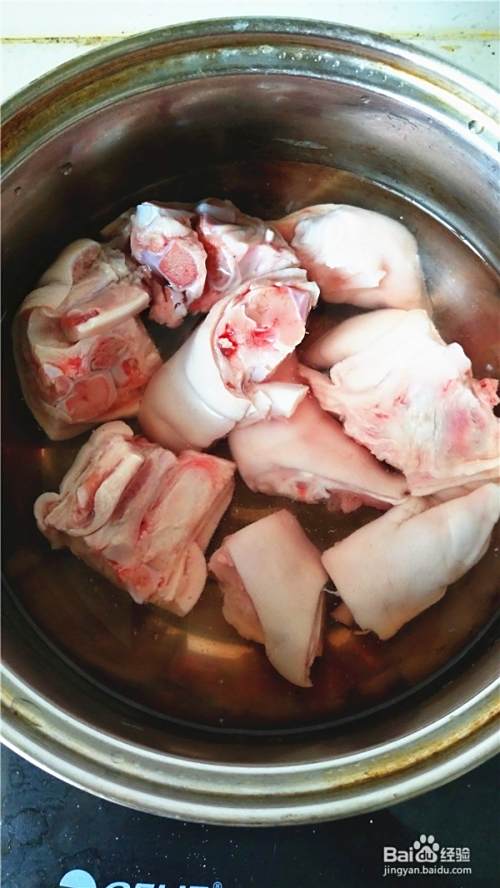 猪蹄剁成小块,泡去血水,冲洗干净。