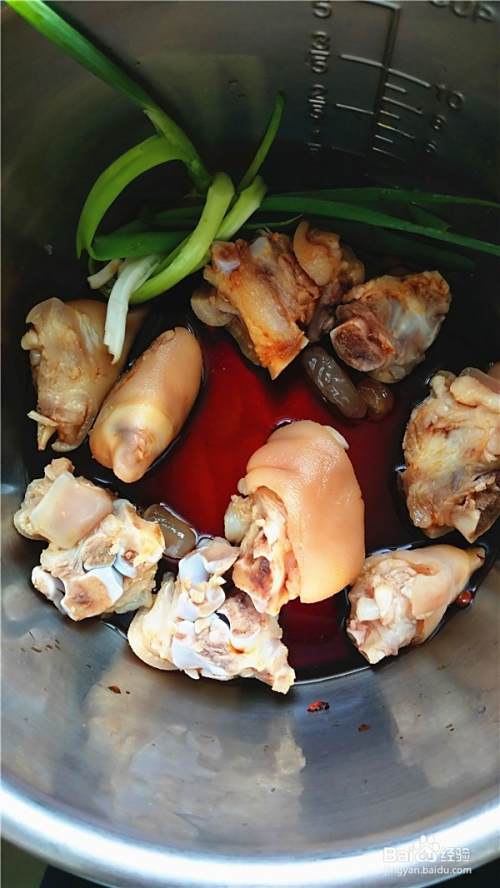 猪蹄放入电压力锅中,加入2中准备好的所有调料,调入适量的盐、老抽和生抽,加入一小碗的清水。