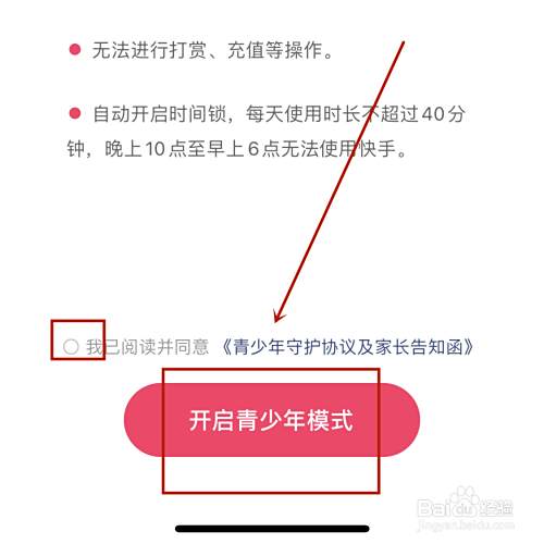 仔细浏览协议后点击【开启青少年模式】;