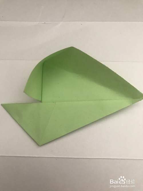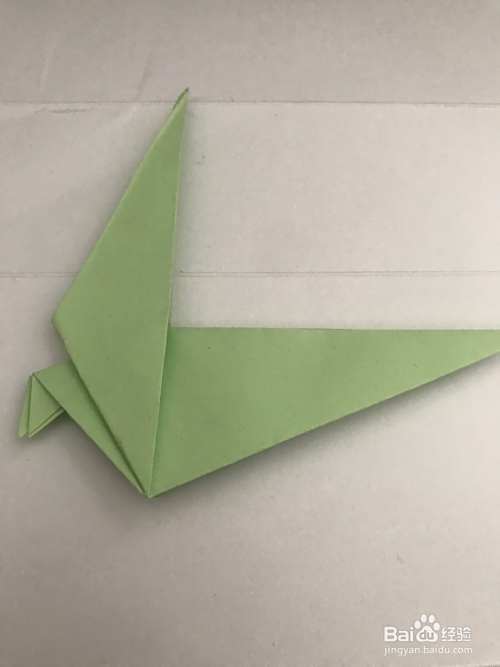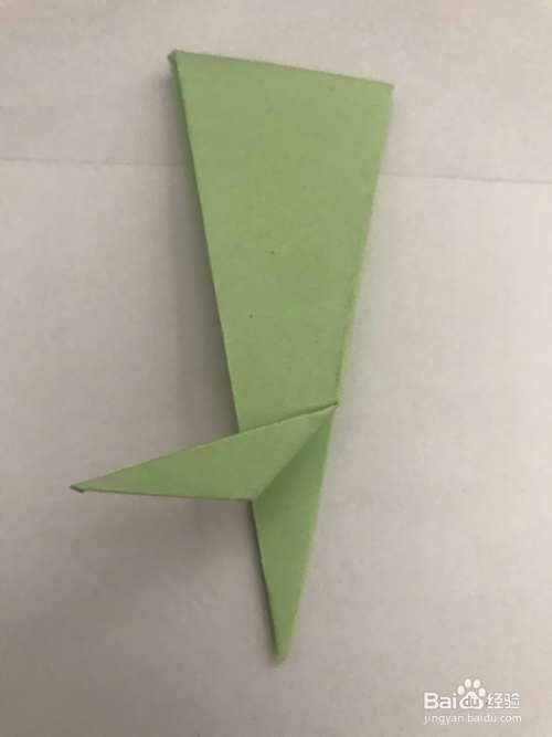 第八步 把腿部折好两次之后 再把它起来 大头朝上 把下面的尖角向左平折 然后取开折痕向里回折