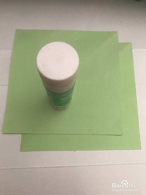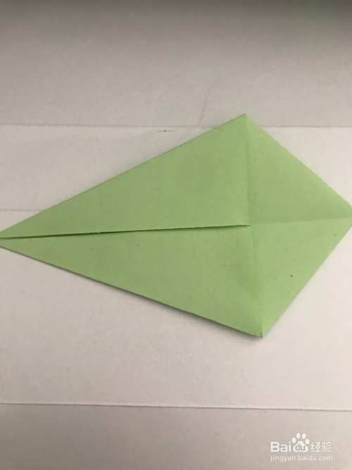 第一步 取一张正方形粉绿色彩纸一张 先把它从下向上对角折叠后取开 然后再把上下两角向中线折叠整齐