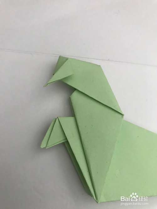 第五步 折完恐龙的前爪之后 再把它上下对折 然后拿起来 把左边部分向上 垂直于中线部位翻折