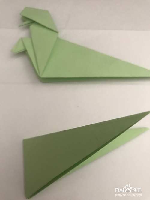 第七步 恐龙的头部向右折向左回折完之后 再把它取开一下 按折痕向里折再向外翻折 这样它的上半部分就完成了 再拿另一个把它平放 上下对折 左右对折
