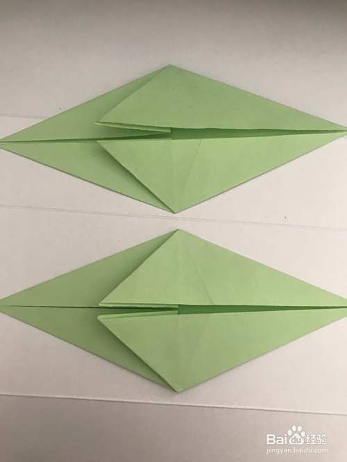 第三步 折完双边三角之后 再把它拿起来把右边的两层尖角翻一层到左边 然后按同样是的方法 再把另一张粉绿色彩纸折叠一根一模一样的放在一旁备用