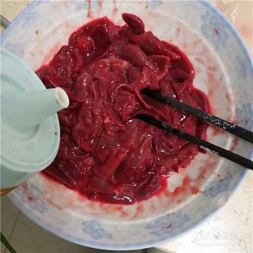 猪肝用清水泡掉血水,冲洗干净,放入冰箱冻硬,再切成薄片。
