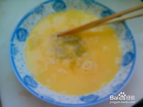 将放好食盐和凉开水的鸡蛋用筷子打碎备用。