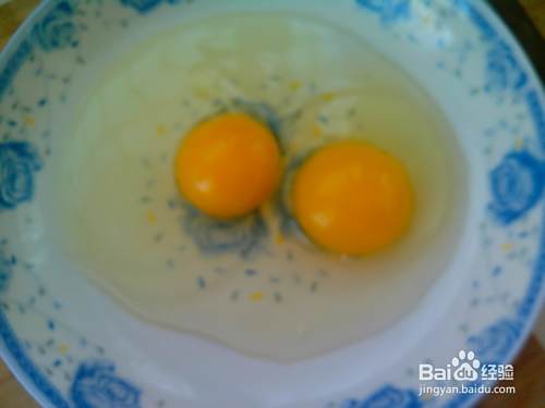 取两个新鲜的鸡蛋打入盘子中再加入适量的水,放适量的食盐备用。
