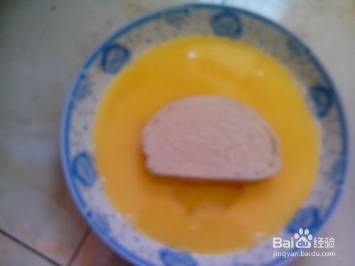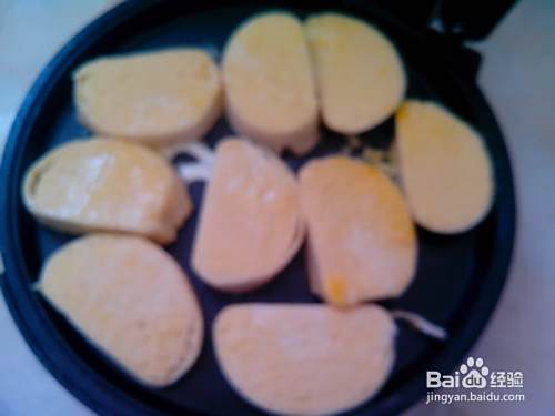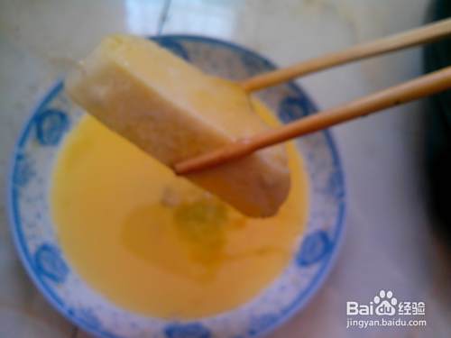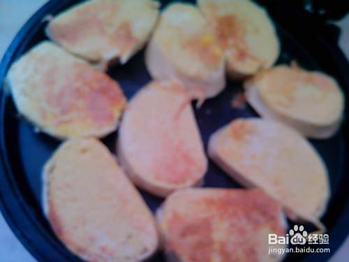 然后取切好的馒头片放入鸡蛋中双面都沾上鸡蛋液,然后放入平底锅中开始煎馒头。