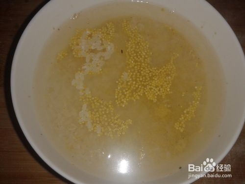 锅中倒入高汤,将大米和小米一同放入锅中熬煮20分钟。