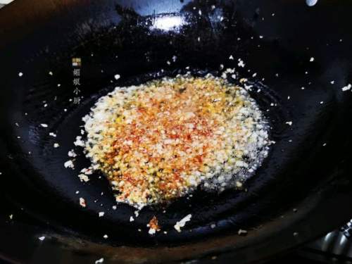 6炒锅烧热加油,萝卜比较吃油,所以油量要比炒菜多些,下入蒜末辣椒粉小火煸香