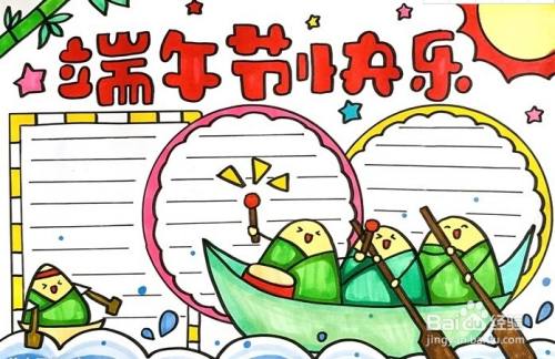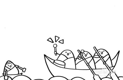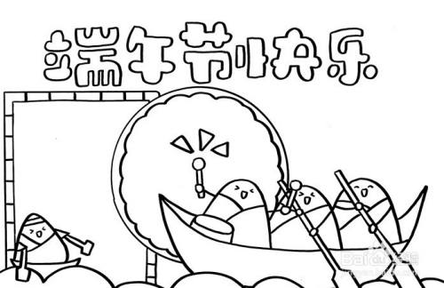 首先在手抄报的底部画上波浪线,并在右下角画上一艘船,船上画上正在划龙舟的几个小粽子,左下角也画上一位划船的粽子。