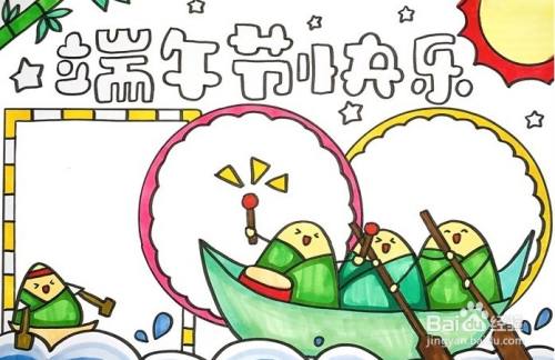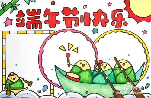 首先在底部画上波浪线,右下角画上船,船上画上几个粽子,再画出三个边框,顶部写上主题,并在右上角画上太阳,先给水面涂蓝色,船涂绿色,粽子涂绿色和黄色,边框涂黄色、红色和金黄色,端午节手抄报就完成了。