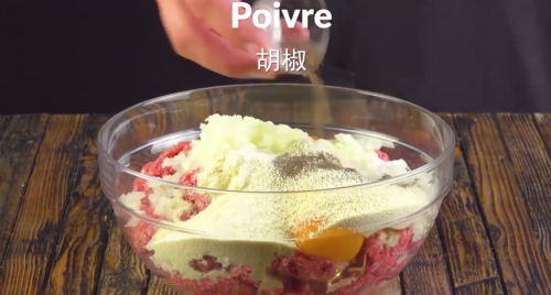 碗内加入1kg肉末、1个洋葱、2个鸡蛋。