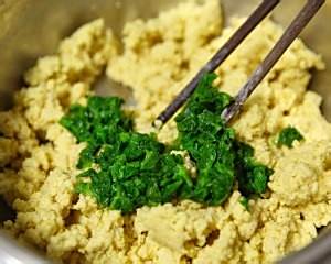 酵母加入温水活化、芹菜叶洗净控水备用,准备好所有食材后,玉米面中缓缓加入开水,用筷子搅拌成小面团、无干粉