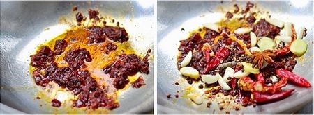 加入1半多的干辣椒,大蒜8粒,姜4片,八角1粒,花椒一半,麻椒一半,一起炒香,再加入清水