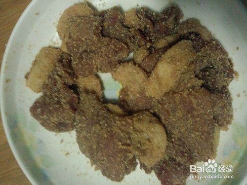 将准备好的蒸肉粉倒入盘子中,拌匀,尽量使每片肉上都裹一层粉。