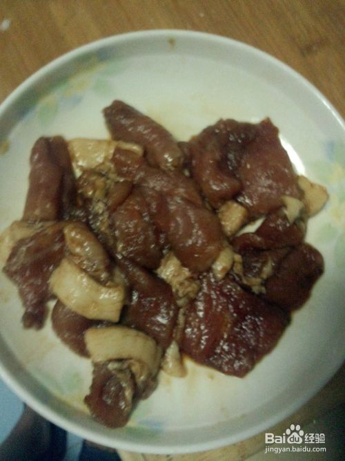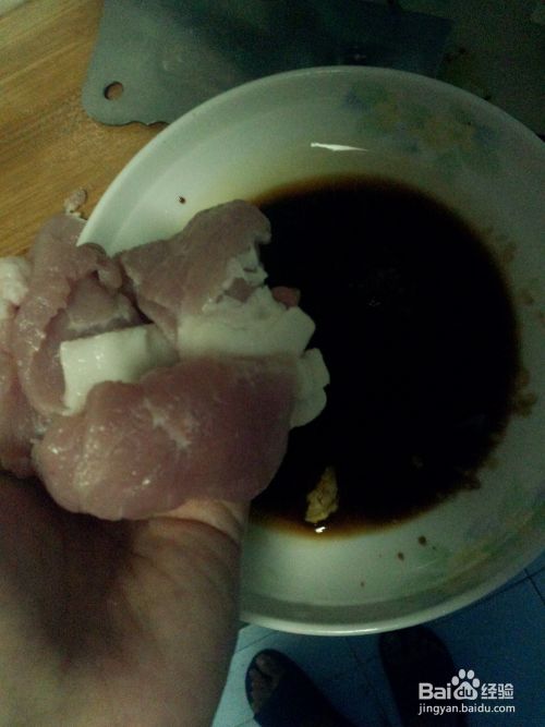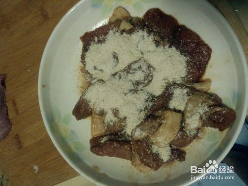 准备好一个盘子,放点姜末、酱油、食盐、鸡精等,放入切好的肉片拌匀。