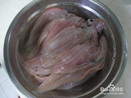 盆内放入舌头鱼,倒入盐、料酒、姜丝、味精腌制30分钟。