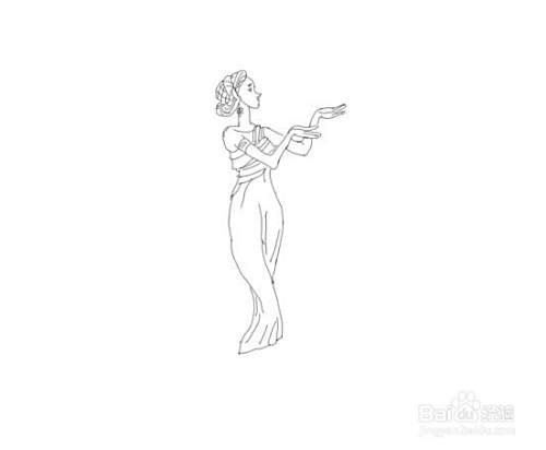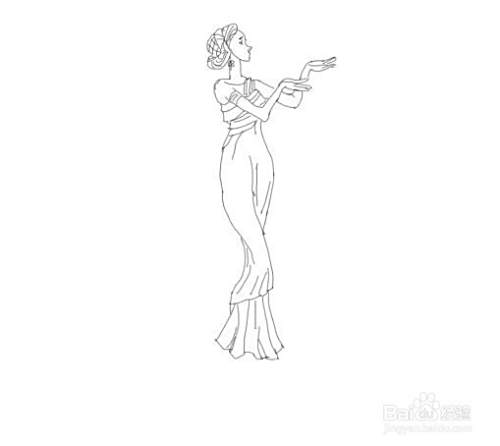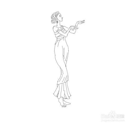 最后再在裙摆下面再画出美女的两只脚,这样跳舞的美女就画好了,如图所示: