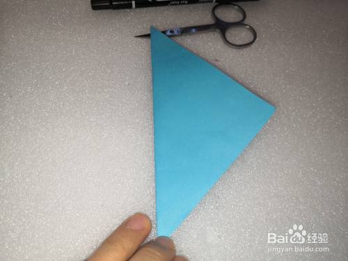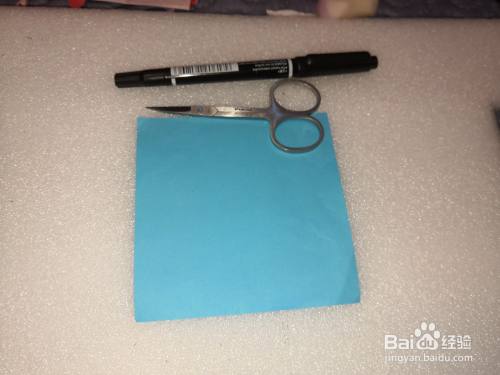 准备所需的材料,一张蓝色正方形彩纸,笔,剪刀。