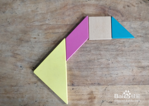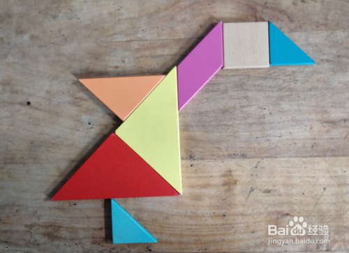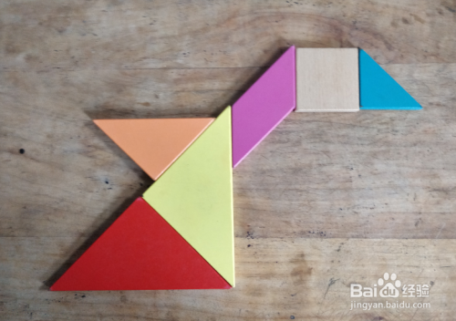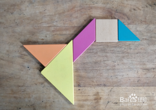 摆上余下的小三角形,放在下侧大三角形的下面挨着,直角在左侧下端,如图。一只大鹅就拼组好了。