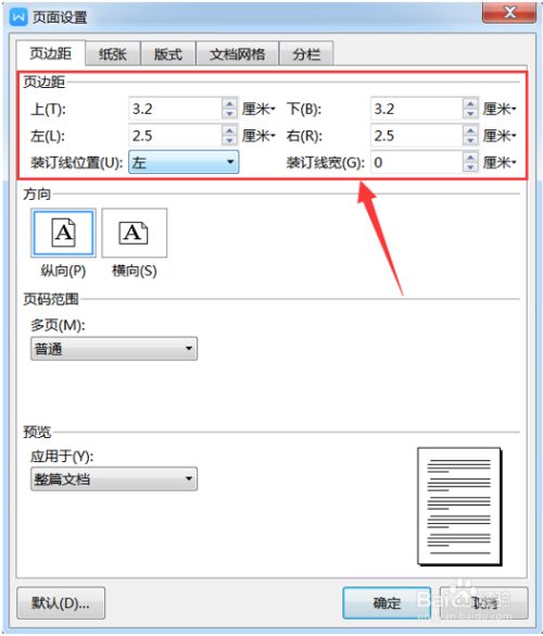 在页面设置的对话框中选择【页边距】选项卡,在页边距输入栏内设置边距大小、装订线的位置及装订线宽