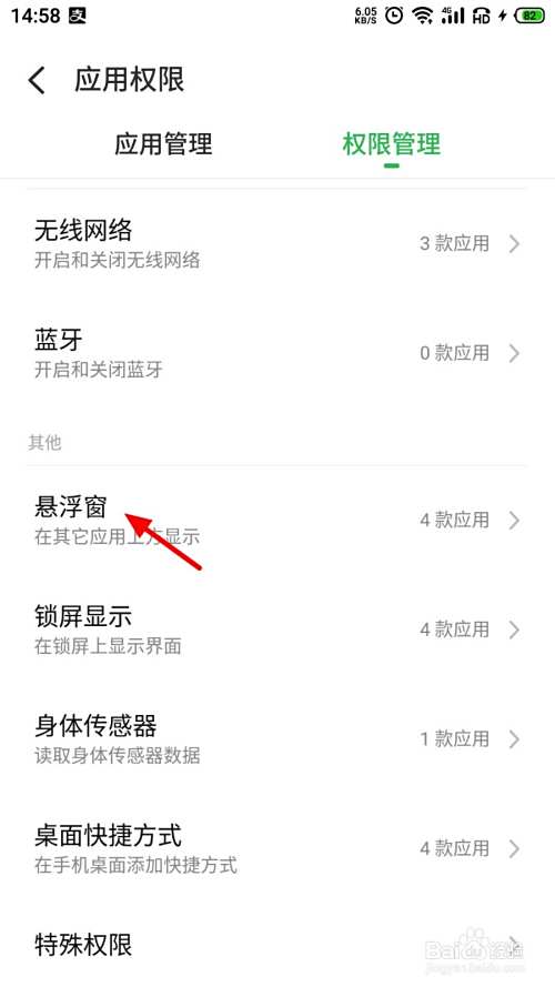 在应用权限页面,点击悬浮窗。