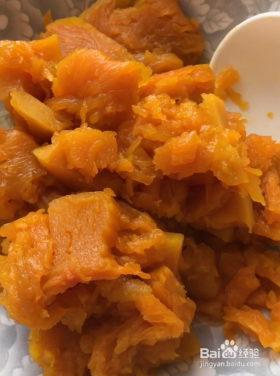 准备老南瓜,清洗干净上锅蒸熟,然后用勺子碾压成南瓜泥。