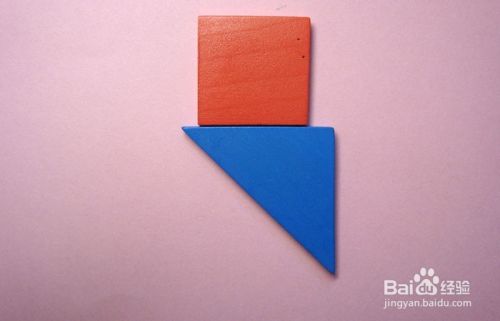 先取红色的正方板和蓝色的三角形板连接,摆放在纸上,作为洒水壶的顶部图形,拼接位置,如下图所示。