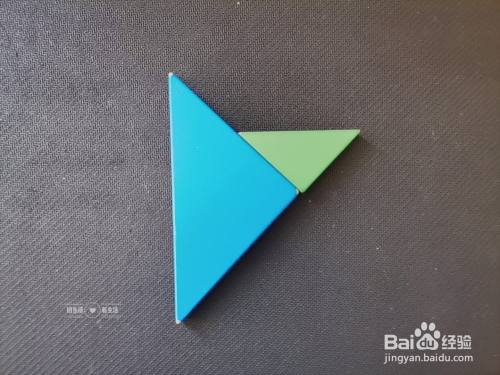 拿出一个粉色小三角形放在绿色小三角形的上面,如下图所示。