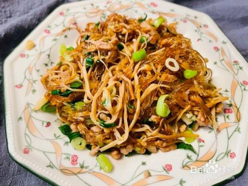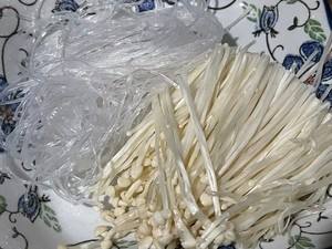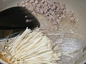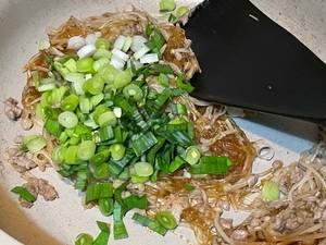 翻炒至金针菇变软,粉丝透明,加适量生抽,出锅前撒上青蒜末。