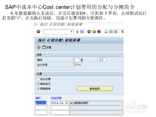 在数据都确认无误后,点击后退按钮,回到如下界面;去掉测试运行前面的“√”,点击执行按钮,完成计划费用的分配操作;