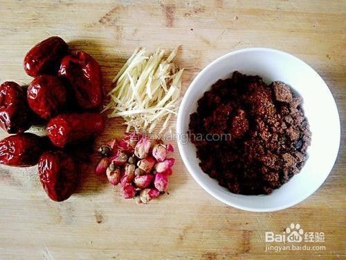 1、将红糖、无核金丝枣、姜片放入炖煮的容器中;