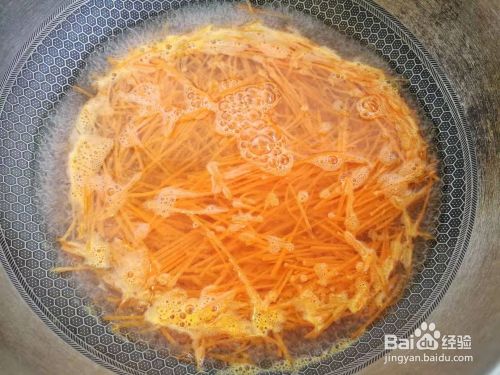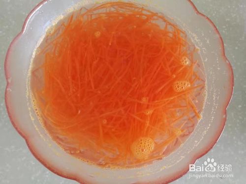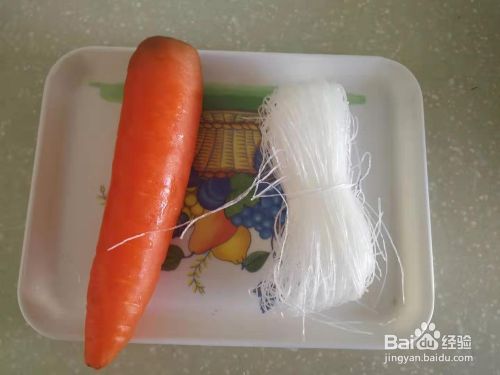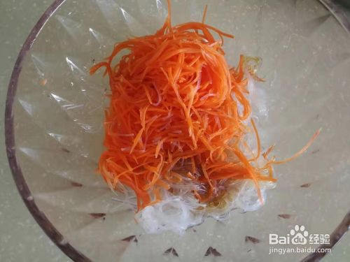 在煮粉丝的时候,把胡萝卜洗净,擦成细丝。捞出粉丝后用锅中的热水把胡萝卜丝烫烫,因为是细丝,稍一烫,断生就可以了,捞出也是过凉后控干水备用。