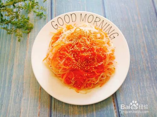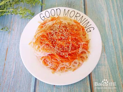 拌匀后装在盘里,上面撒上熟白芝麻。这种胡萝卜拌粉丝的做法,味道清淡,爽口。