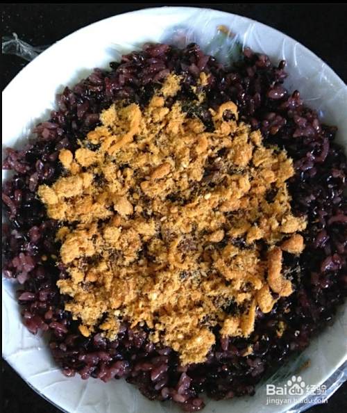 料理准备好的食材:紫米洗净煮熟成紫米饭备用,油条切小块,黄瓜切丁,鸡蛋煮熟切小块(喜欢咸鸭蛋的小伙伴可以选择咸鸭蛋蛋黄),肉松放入碗中备用。
