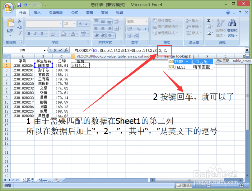由于需要匹配的数据在Sheet1的第二列,所以在数据后面加上“,2,”(其中“,”是英文下的逗号),然后点击回车。