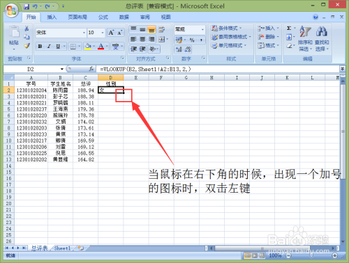 让光标放在第一行的性别上的单元格的右下角,出现加号的符号时,双击左键。