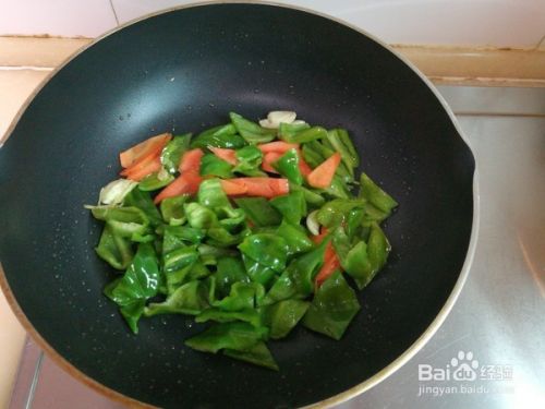 胡萝卜和青椒翻炒两分钟左右,然后将护心肉放入锅中;