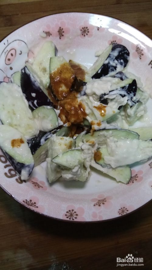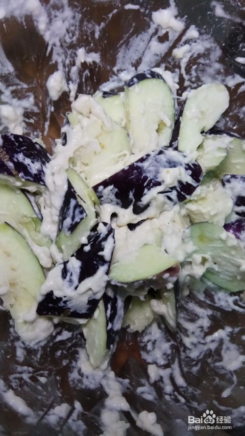 将茄子捞出,沥干水分,然后裹上一层面粉。