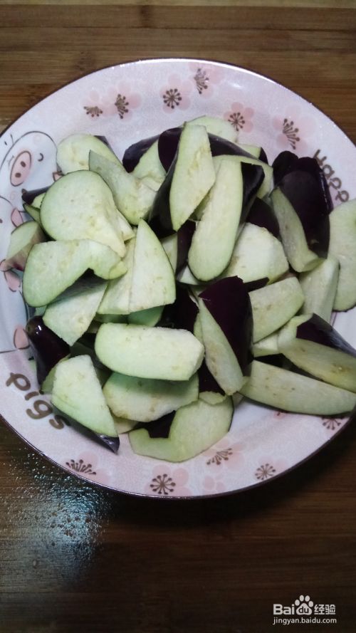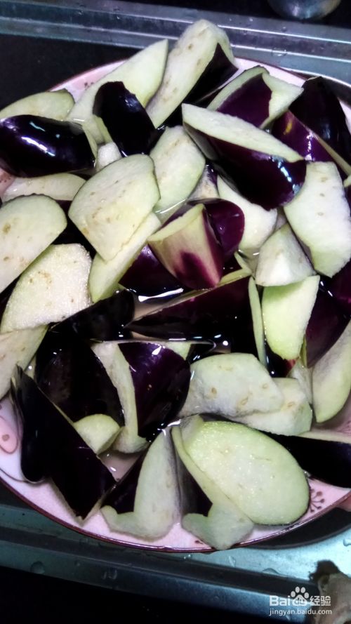 将茄子切成滚刀块,然后用淡盐水浸泡一下。