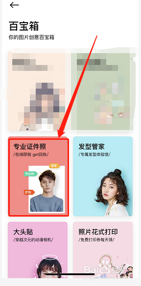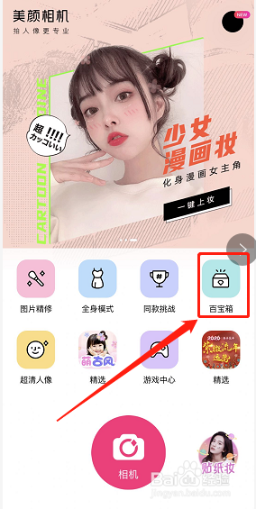 1.点击打开“美颜相机”软件,在首界面选择“百宝箱”功能点击;