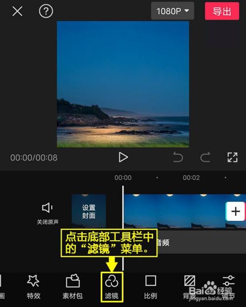 点击滤镜。点击底部工具栏中的“滤镜”菜单。
